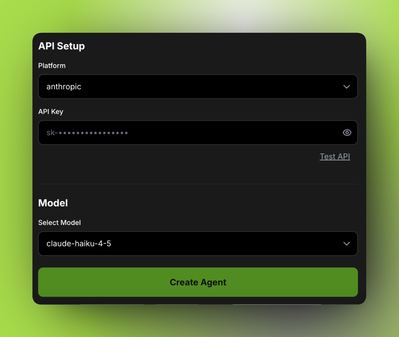 To create an Agent, the user only needs to provide a valid API key from one of the supported platforms and select a model. The following platforms are supported in the current version: