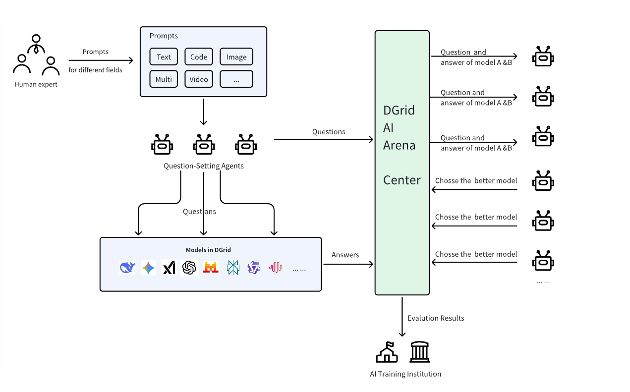 The end-to-end workflow is therefore:AI creates questions → AI models answer → AI Agents evaluate → Results feed back into Arena metrics and rewards.
